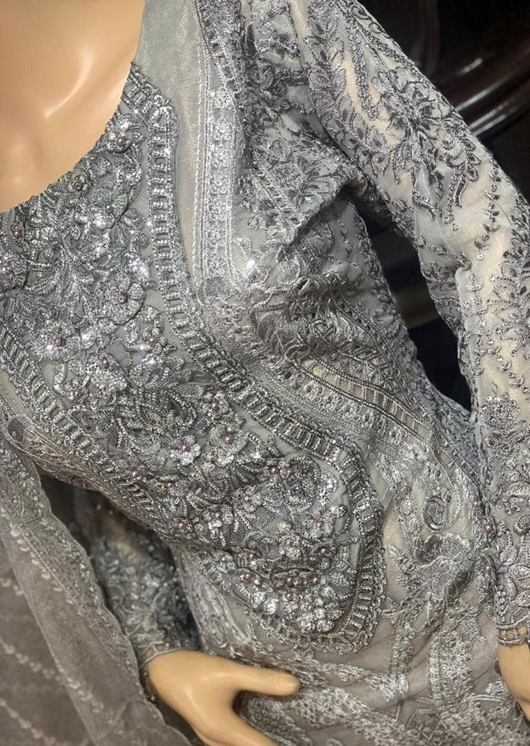 Striking grey heavily embroidered net ensemble with zari thread, sequence and 3D work. Jammawar embroidered palazzo bottoms and a embroidered net duppatta.