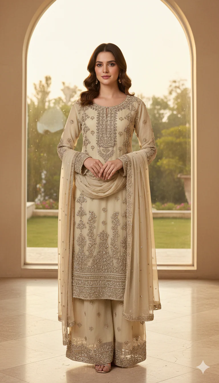 This elegant chiffon suit features delicate tilla and thread embroidery, making it a stunning choice for any occasion.