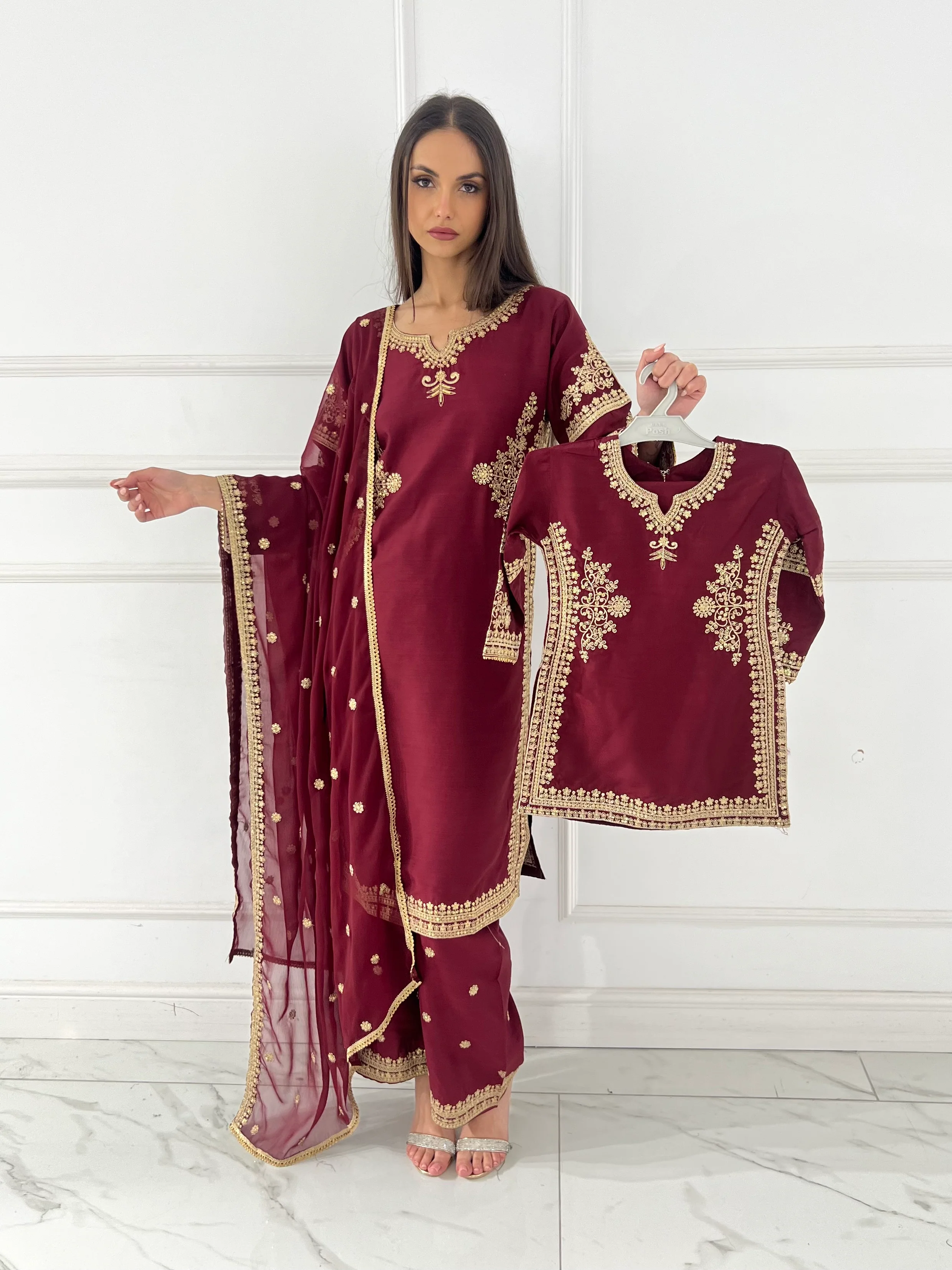 Experience the joy of matching outfits with your little one in our New Embroidered Mummy n Me Outfit. Made with lightweight Fabric and adorned with intricate ghotta work, this stunning outfit will make you and your child stand out in any gathering. Perfect for creating unforgettable memories together!